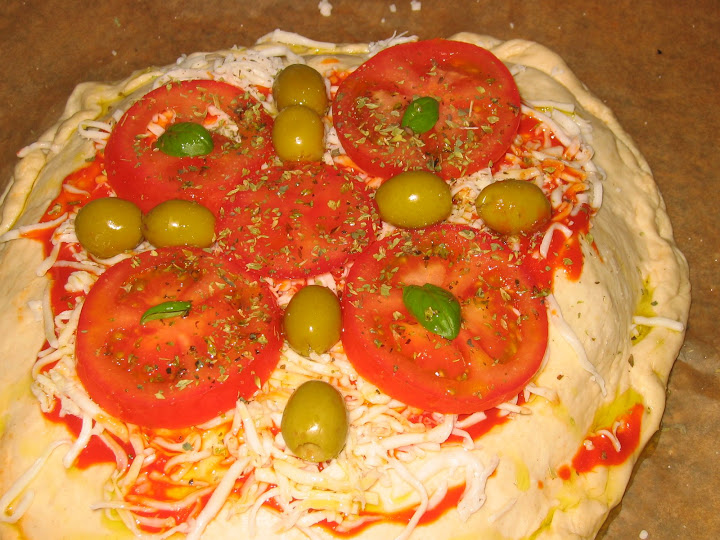 Yo aquí le puse tomate frito, muzzarella, rodajas de tomate natural, oregano, unas hojitas de albahaca, y aceitunas verdes.