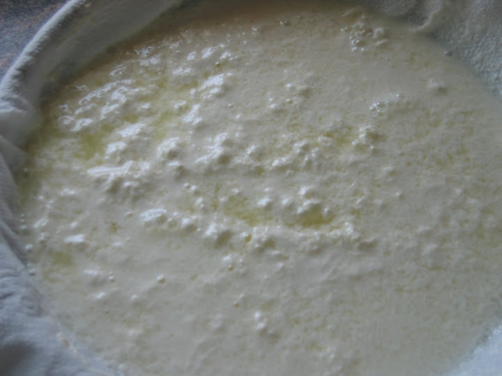En un colador, pongo un paño limpio y dejo drenar el suero